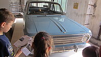Das Auto und die Fische waren cool. Das Auto war sehr alt. Das Auto hatte 3 Kronen an der Haube.