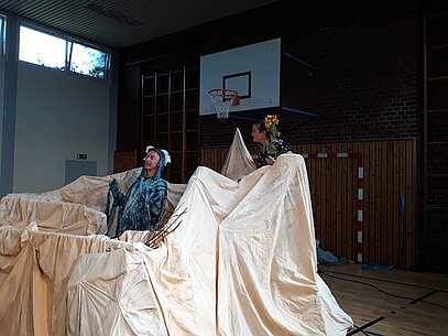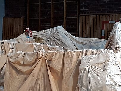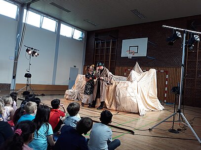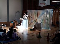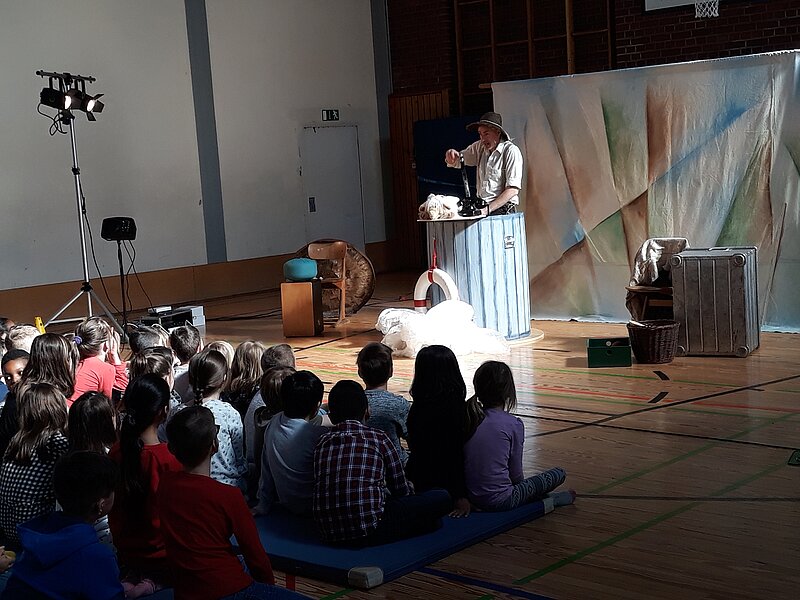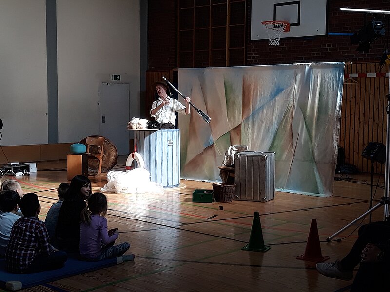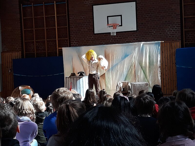Heute war das Theater "Die Mimosen" der Stadtwerke Essen bei uns. Die 3. und 4. Schuljahre trafen sich um 10.00 Uhr in der Turnhalle und schauten sich die Aufführung der Geschichte "Tuvalu darf nicht sterben" an.